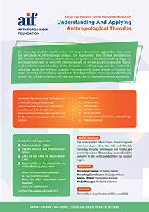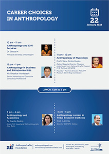 Anthropos India Foundation organized a two-day Anthropology Career Conclave on 22nd and 29th of January 2022 for career guidance in anthropology. The event was attended by undergraduate, graduate and research scholars from different disciplines across the country and had few international students. Experts on different subject matters guided a total of 64 young participants. The first day of the conclave had Dr. Geeta M., Principal Secretary, Government of Chhattisgarh guided the students on ‘Anthropology and Civil Services’followed by Prof. Charu Smita Gupta, Deputy Director (Retd.), National Crafts Museum on‘Anthropology of Museology’. Mr. Bhaskar Venkatesh, Senior Marketing Consultant, delivered a talk on ‘Anthropology in Business and Entrepreneurship’ and Dr. Sunita Reddy from Jawaharlal Nehru University talked on ‘Anthropology and Academics’. Prof. A. B. Ota, Director, SCSTRTI, Odisha gave a talk on ‘Anthropology Careers in Tribal Research Institutes’ and encouraged the young participants to engage in rigorous fieldwork actively. The second day of the conclave started with Ms. Swasti Acharya’s words on ‘Anthropology, AI and Startups’, followed by Prof. Kewal Krishan, from Panjab University on ‘Anthropology and Careers in forensic Sciences’. Prof. N C Dash, from KISS delivered a talk on ‘Careers in Population Anthropology’ and Dr. Arbind Sinha, Advisor, CDMA-MICA on ‘Anthropology and Communication’. Dr. Vipin Gupta from University of Delhi guided the participants on ‘Anthropology and Careers in the field of Health’ and Dr. Piyush Ranjan Sahoo, from AnSI on“Anthropology and Careers in Anthropological Survey of India”. Late afternoon session was by Prof R. Siva Prasad on ‘Anthropology in Development Sector - NGOs/ INGOs’ and on ‘Anthropology and filmmaking’ by Dr. Alison L Kahn, Dr. Avitoli Zhimo. All the sessions allowed the participants to interact directly with the experts and seek guidance on their future in Anthropology.